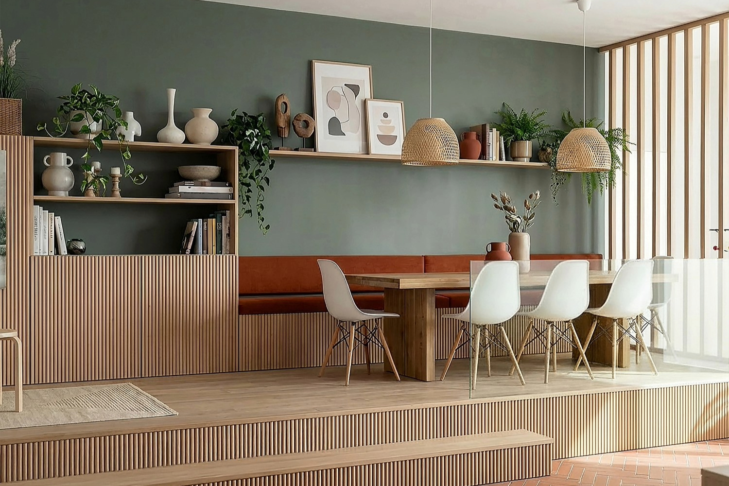 Warm timber and a grounding sage green establish a harmonious foundation for this dining area. The fitted banquette and raised platform create concealed appliance storage behind the adjoining wall, combining architectural presence with thoughtful functionality.