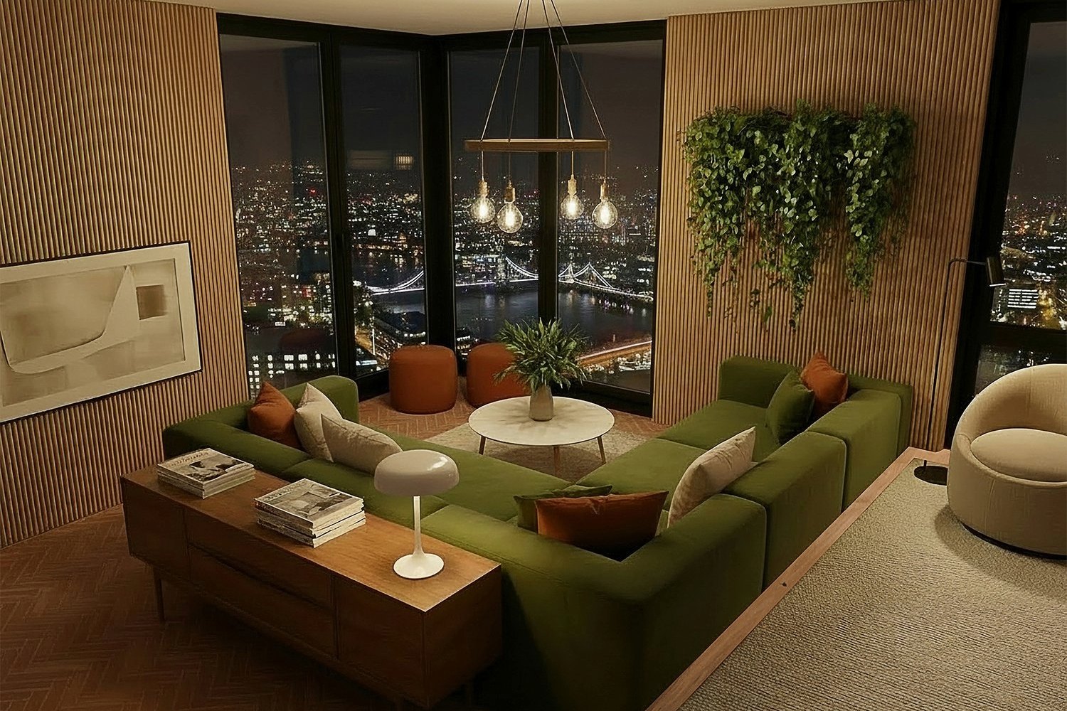 - Contemporary London apartment living room with slatted timber wall panels, wall-mounted TV, integrated hanging plants, deep green sectional sofa and floor-to-ceiling city views at night.