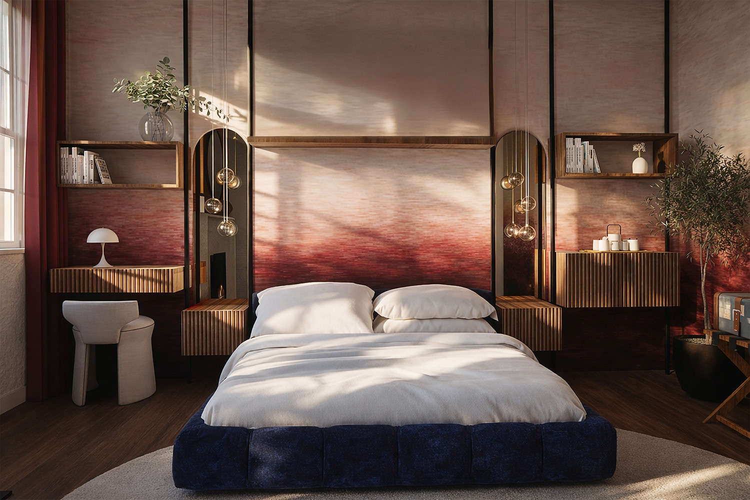- Bedroom with bespoke walnut shelving, bold feature wall, sculptural pendant lighting and restored timber floorboards.