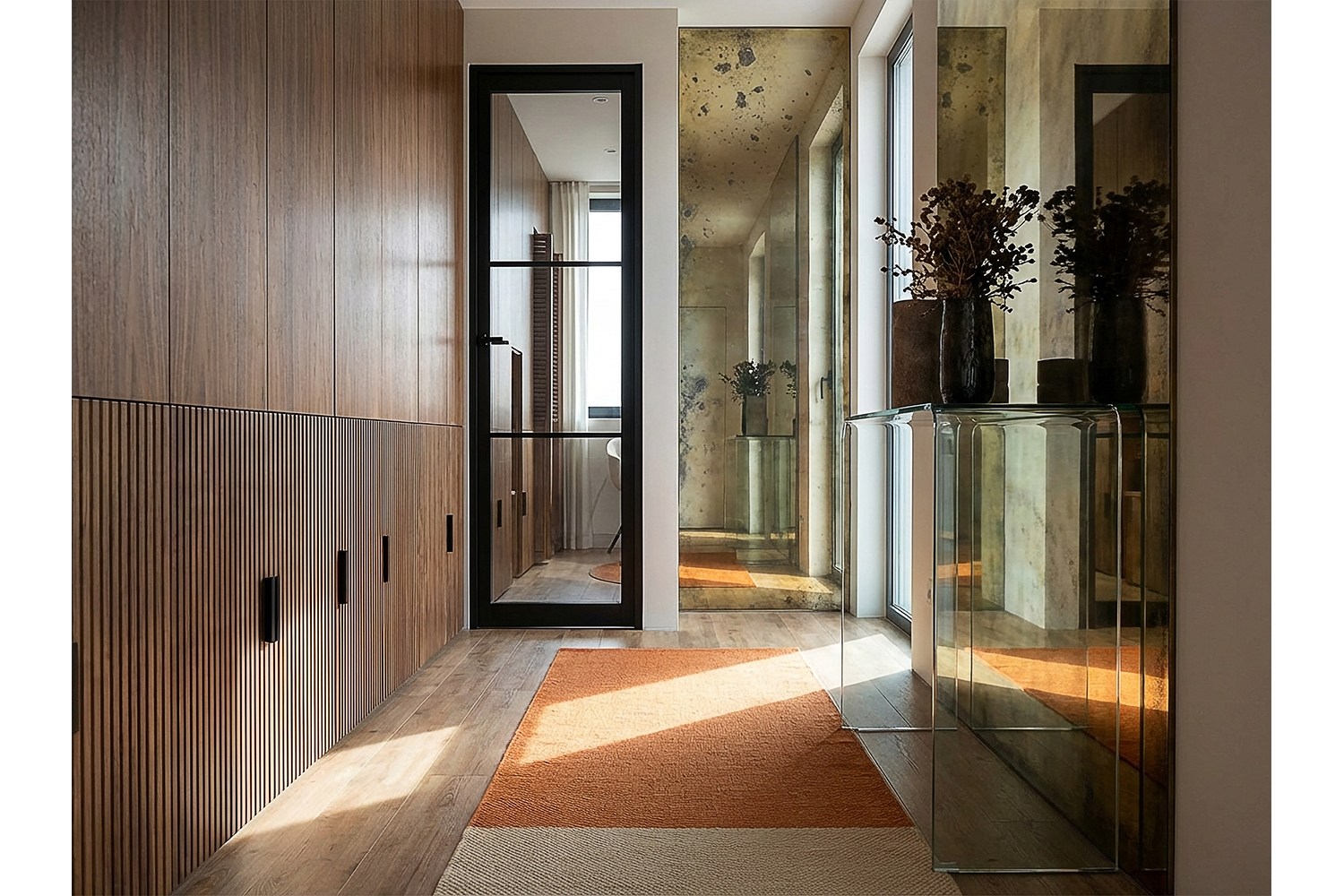 - Contemporary hallway with full-height timber joinery, slatted wood detailing, mirrored wall panels, glass console table and black-framed glazed internal door.