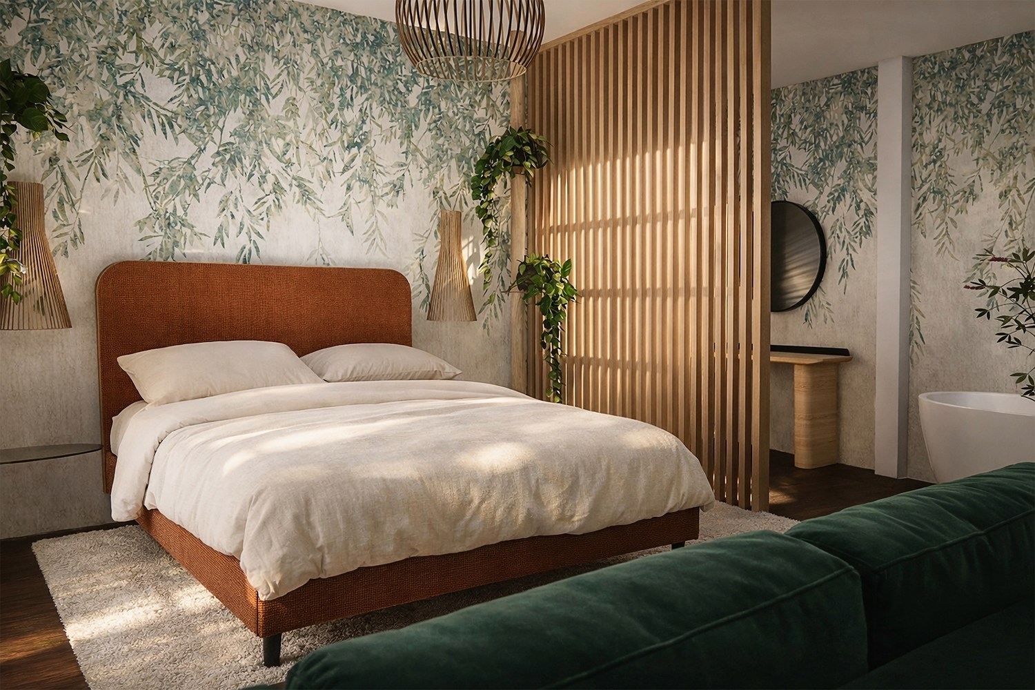 - Nature-inspired bedroom in a Grade II listed building with slatted timber screen, freestanding bath, bespoke sofa and restored timber floorboards.