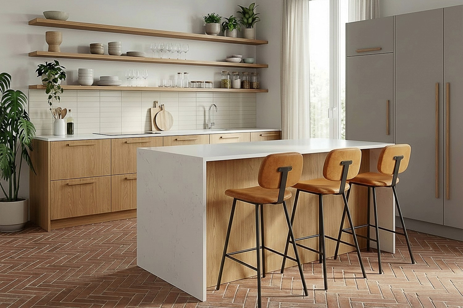 - Contemporary oak kitchen with open shelving and a solid white island, leather bar stools and herringbone brick flooring.