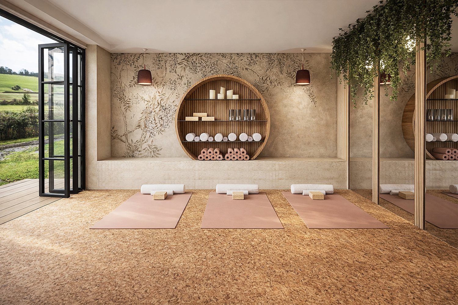 Designed as a dedicated yoga studio, this space maximises light and connection to the landscape through expansive bi-fold doors. A circular timber shelving installation creates a distinctive focal point while incorporating practical storage. Cork flooring and layered lighting establish a calm, balanced environment for mindful movement.